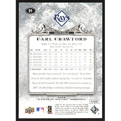 This is a 2008 UD A Piece of History Carl Crawford baseball card. The card is #91 and pictures show condition.