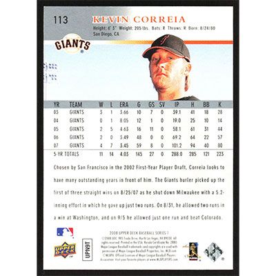 This is a 2008 Upper Deck Kevin Correia baseball card. The card is #113 and pictures show condition.