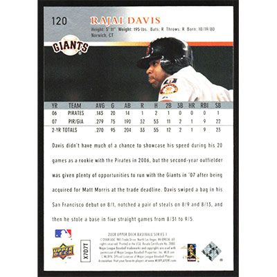 This is a 2008 Upper Deck Rajai Davis baseball card. The card is #120 and pictures show condition.