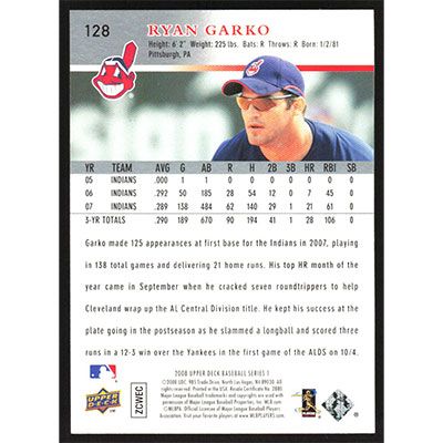This is a 2008 Upper Deck Ryan Garko baseball card. The card is #128 and pictures show condition.