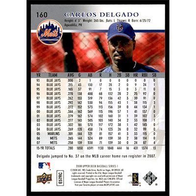 This is a 2008 Upper Deck Carlos Delgado baseball card. The card is #160 and pictures show condition.