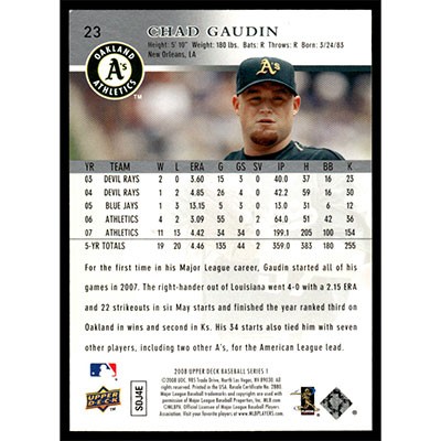 This is a 2008 Upper Deck Chad Gaudin baseball card. The card is #23 and pictures show condition.
