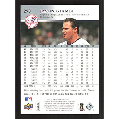 This is a 2008 Upper Deck Jason Giambi baseball card. The card is #298 and pictures show condition.