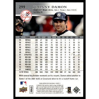 This is a 2008 Upper Deck Johnny Damon baseball card. The card is #299 and pictures show condition.