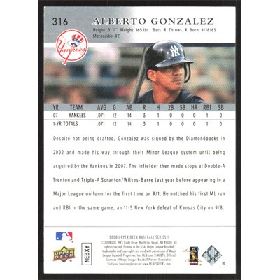 This is a 2008 Upper Deck Alberto Gonzalez baseball card. The card is #316 and pictures show condition.