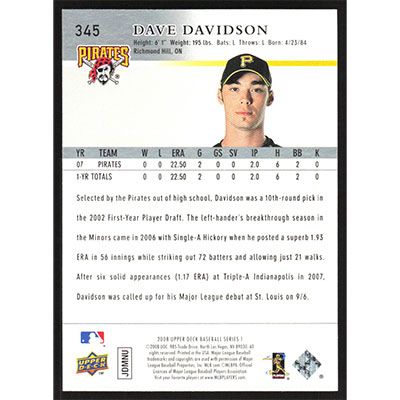 This is a 2008 Upper Deck Dave Davidson baseball card. The card is #345 and pictures show condition.