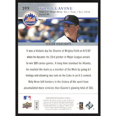 This is a 2008 Upper Deck Tom Glavine Season Highlights baseball card. The card is #399 and pictures show condition.