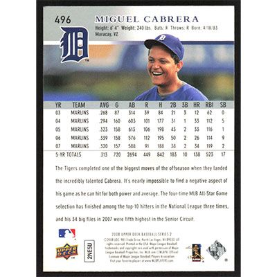 This is a 2008 Upper Deck Miguel Cabrera baseball card. The card is #496 and pictures show condition.