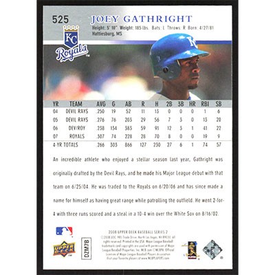 This is a 2008 Upper Deck Joey Gathright baseball card. The card is #525 and pictures show condition.