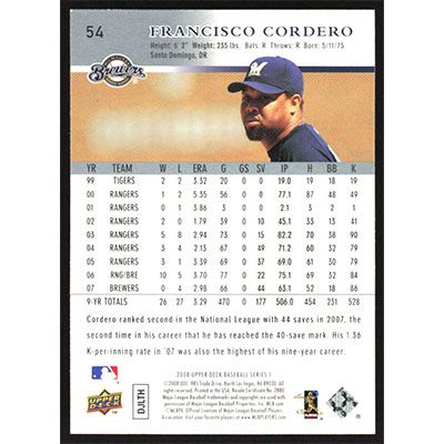 This is a 2008 Upper Deck Francisco Cordero baseball card. The card is #54 and pictures show condition.