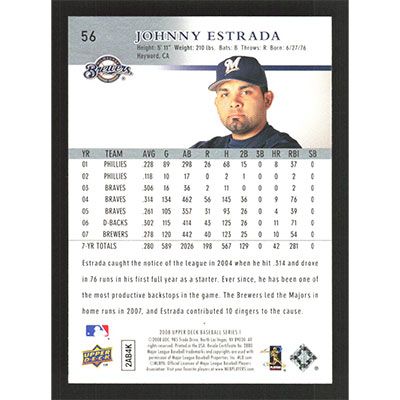 This is a 2008 Upper Deck Johnny Estrada autographed baseball card. This card has been signed, in blue, by Johnny Estrada, and is guaranteed authentic by Ballcardz.com. The card is #56 and pictures show condition.