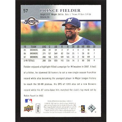 This is a 2008 Upper Deck Prince Fielder baseball card. The card is #57 and pictures show condition.