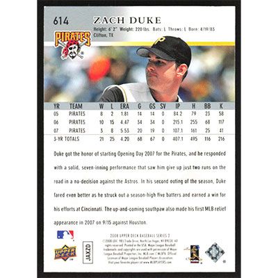 This is a 2008 Upper Deck Zach Duke baseball card. The card is #614 and pictures show condition.