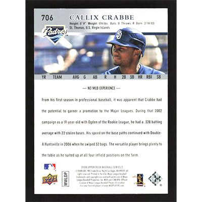 This is a 2008 Upper Deck Callix Crabbe baseball card. The card is #706 and pictures show condition.