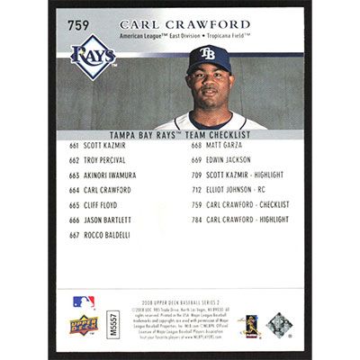This is a 2008 Upper Deck Carl Crawford Team Checklsit baseball card. The card is #759 and pictures show condition.