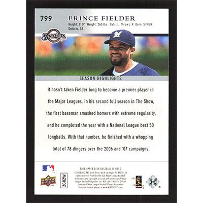 This is a 2008 Upper Deck Prince Fielder Season Highlights baseball card. The card is #799 and pictures show condition.