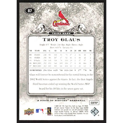This is a 2008 Upper Deck A Piece of History Troy Glaus baseball card. The card is #87 and pictures show condition.