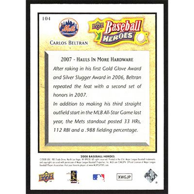 This is a 2008 Upper Deck Baseball Heroes Carlos Beltran baseball card. The card is #104 and pictures show condition.