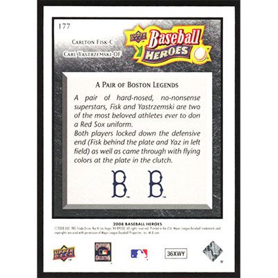 This is a 2008 Upper Deck Baseball Heroes Black Carlton Fisk and Carl Yastrzemski baseball card. The card is #177 and pictures show condition. Team(s): Boston Red Sox