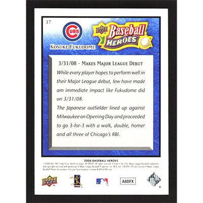 This is a 2008 Upper Deck Baseball Heroes Navy Blue Kosuke Fukudome baseball card. The card is #37 and pictures show condition. This card is limited; #'d 124/199.
