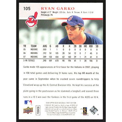 This is a 2008 Upper Deck First Edition Ryan Garko baseball card. The card is #105 and pictures show condition.
