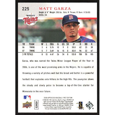 This is a 2008 Upper Deck First Edition Matt Garza baseball card. The card is #225 and pictures show condition.