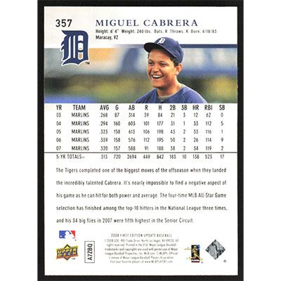 This is a 2008 Upper Deck First Edition Miguel Cabrera baseball card. The card is #357 and pictures show condition.