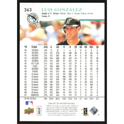 This is a 2008 Upper Deck First Edition Luis Gonzalez baseball card. The card is #363 and pictures show condition.