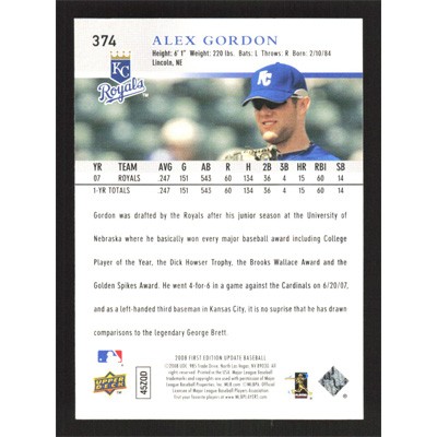 This is a 2008 Upper Deck First Edition Alex Gordon baseball card. The card is #374 and pictures show condition.
