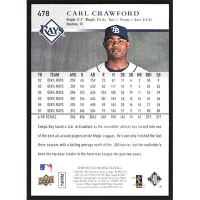 This is a 2008 Upper Deck First Edition Carl Crawford baseball card. The card is #478 and pictures show condition.