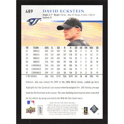 This is a 2008 Upper Deck First Edition David Eckstein baseball card. The card is #489 and pictures show condition.