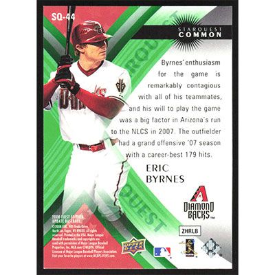 This is a 2008 Upper Deck First Edition StarQuest Eric Byrnes baseball card. The card is #SQ-44 and pictures show condition. Team(s): Arizona Diamondbacks