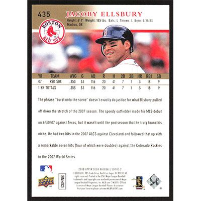 This is a 2008 Upper Deck Gold Jacoby Ellsbury baseball card. The card is #435 and pictures show condition. This card is limited; #'d 43/99. Team(s): Boston Red Sox