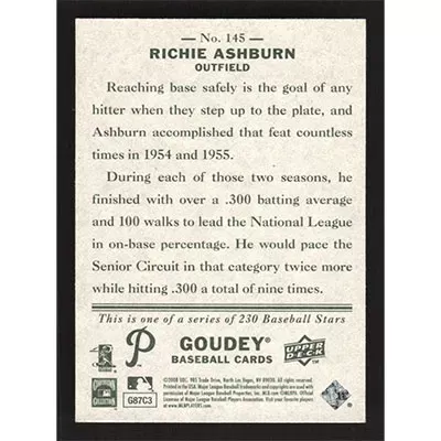 This is a 2008 Upper Deck Goudey Richie Ashburn baseball card. The card is #145 and pictures show condition.