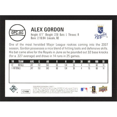 This is a 2008 Upper Deck O-Pee-Chee Alex Gordon baseball card. The card is #OPC-AG and pictures show condition.