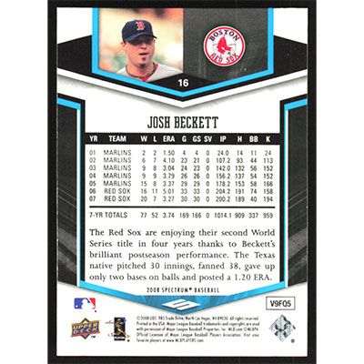This is a 2008 Upper Deck Spectrum Josh Beckett baseball card. The card is #16 and pictures show condition.
