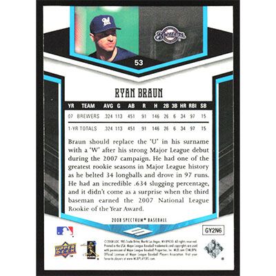 This is a 2008 Upper Deck Spectrum Ryan Braun baseball card. The card is #53 and pictures show condition.