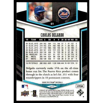 This is a 2008 Upper Deck Spectrum Carlos Delgado baseball card. The card is #61 and pictures show condition.