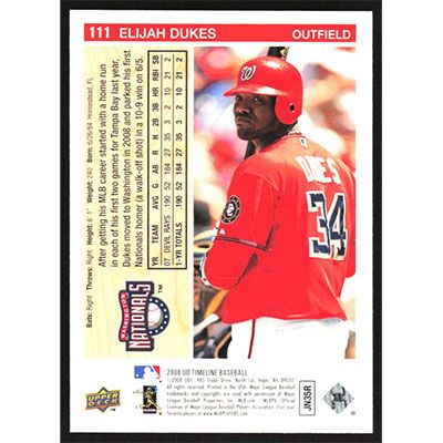 This is a 2008 Upper Deck Timeline Elijah Dukes 1992 baseball card. The card is #111 and pictures show condition.