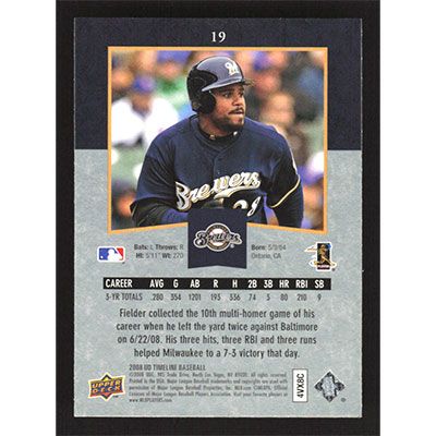 This is a 2008 Upper Deck Timeline Prince Fielder baseball card. The card is #19 and pictures show condition.