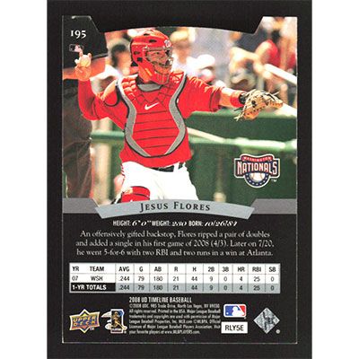 This is a 2008 Upper Deck Timeline Jesus Flores 1995 SP Top Prospects baseball card. The card is #195 and pictures show condition. Team(s): Washington Nationals