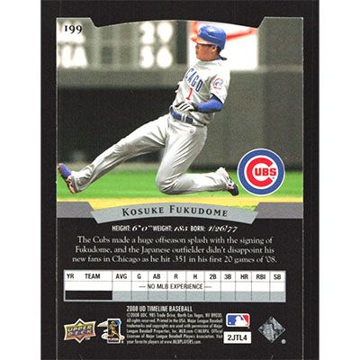 This is a 2008 Upper Deck Timeline Kosuke Fukudome 1995 SP Top Prospects Die Cut baseball card. The card is #199 and pictures show condition. Team(s): Chicago Cubs Rookie Card (RC)
