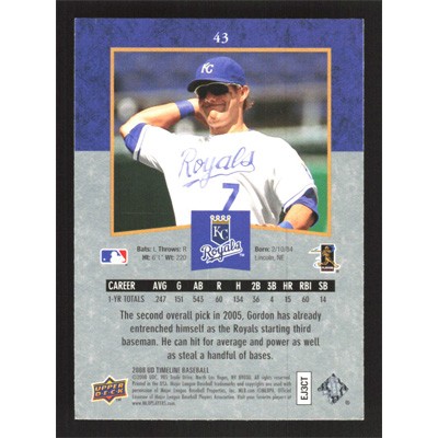 This is a 2008 Upper Deck Timeline Alex Gordon baseball card. The card is #43 and pictures show condition.