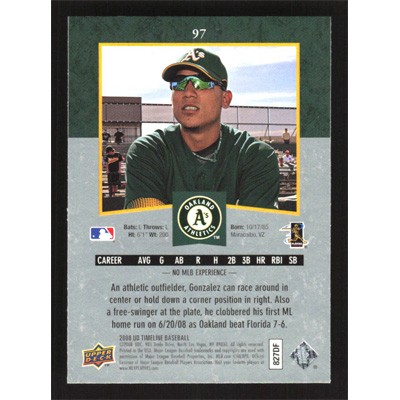 This is a 2008 Upper Deck Timeline Carlos Gonzalez baseball card. The card is #97 and pictures show condition. Team(s): Oakland Athletics Rookie Card (RC)