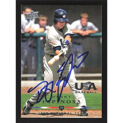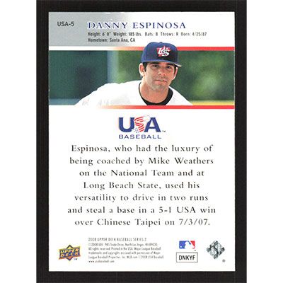 This is a 2008 Upper Deck USA National Team Danny Espinosa autographed baseball card. This card has been signed, in blue, by Danny Espinosa, and is guaranteed authentic by Ballcardz.com. The card is #USA-5 and pictures show condition.