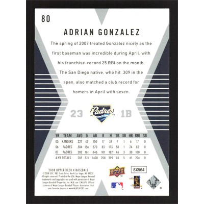 This is a 2008 Upper Deck X Adrian Gonzalez baseball card. The card is #80 and pictures show condition.