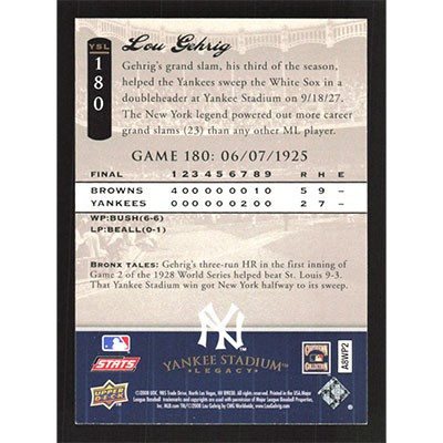 This is a 2008 Upper Deck Yankee Stadium Legacy Collection Lou Gehrig baseball card. The card is #180 and pictures show condition. Team(s): New York Yankees
