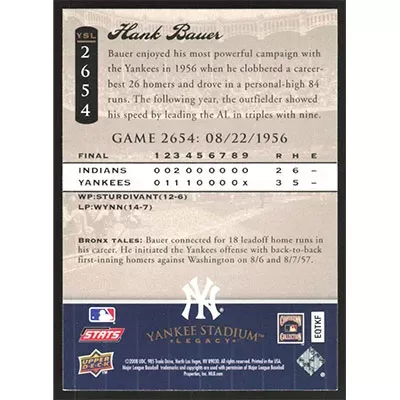 This is a 2008 Upper Deck Yankee Stadium Legacy Collection Hank Bauer baseball card. The card is #2654 and pictures show condition. Team(s): New York Yankees