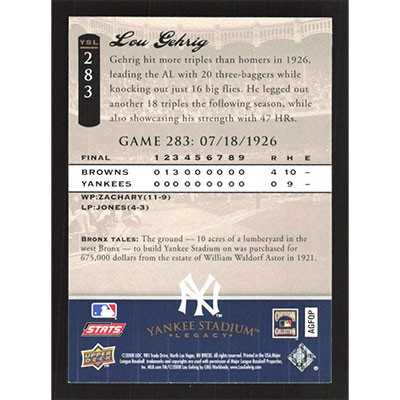 This is a 2008 Upper Deck Yankee Stadium Legacy Collection Lou Gehrig baseball card. The card is #283 and pictures show condition. Team(s): New York Yankees