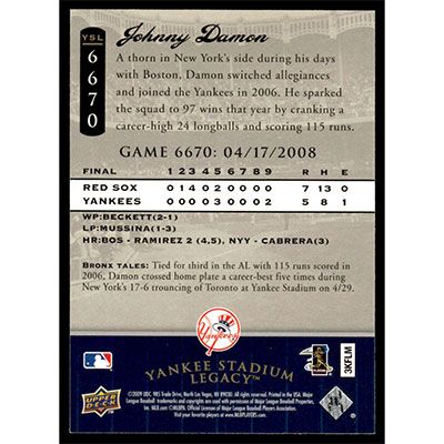 This is a 2008 Upper Deck Yankee Stadium Legacy Collection Johnny Damon baseball card. The card is #6670 and pictures show condition. Team(s): New York Yankees